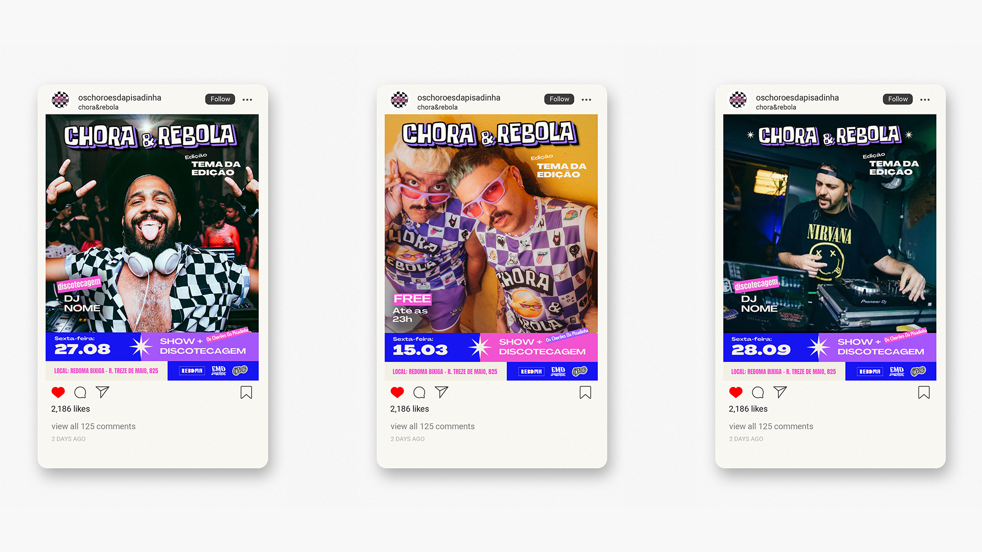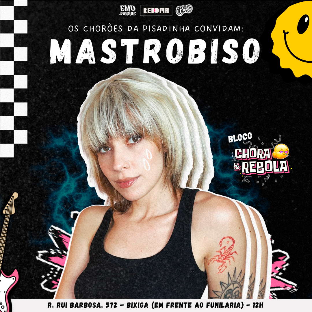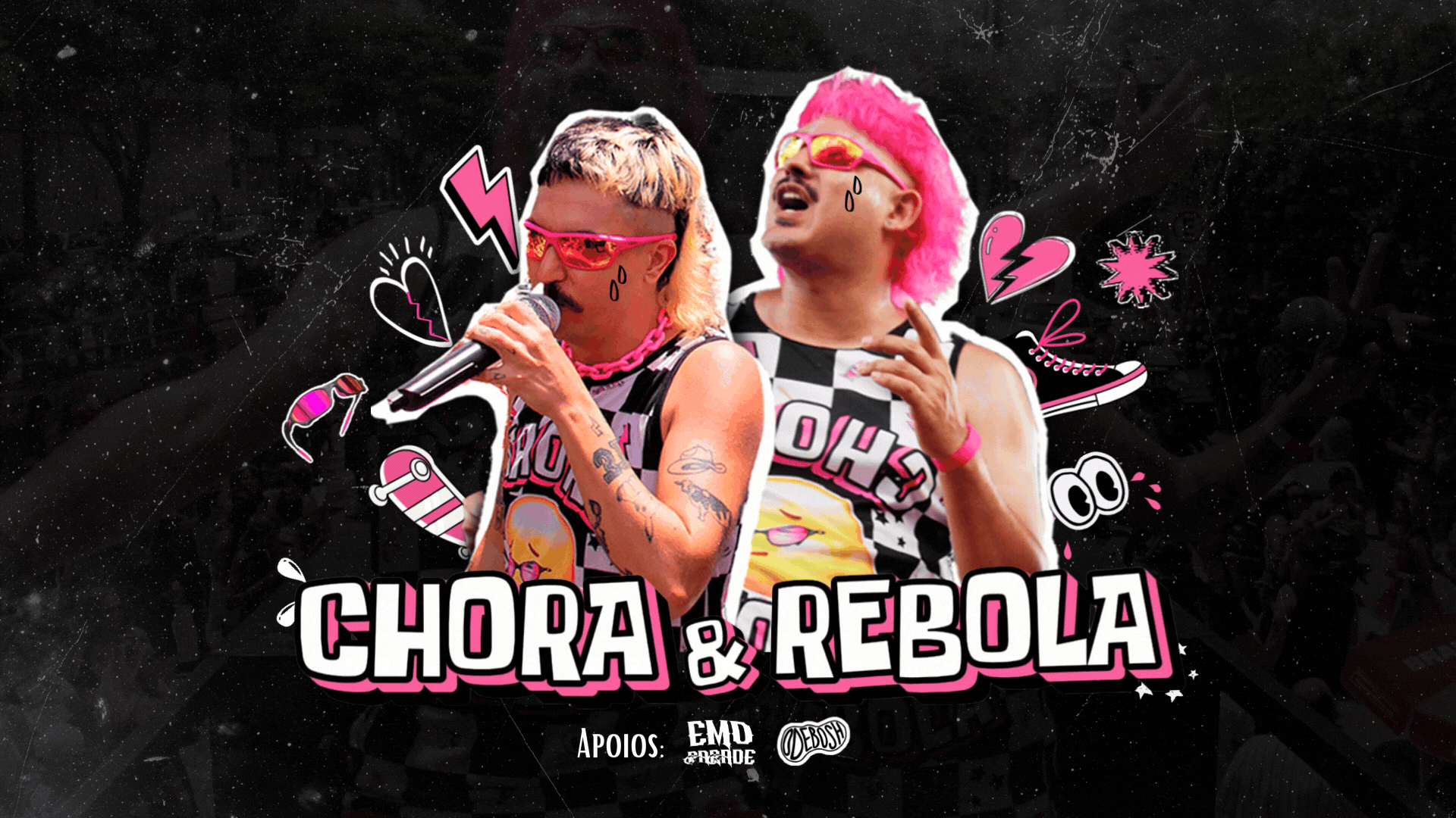 O objetivo foi criar uma identidade visual para o primeiro bloco de carnaval do grupo, que representasse sua energia, personalidade e proposta cultural, unificando a comunicação do projeto musical e do evento. Foi desenvolvido um visual forte e reconhecível, misturando o emo com o piseiro criado especialmente pelo grupo Os Chorões da Pisadinha.