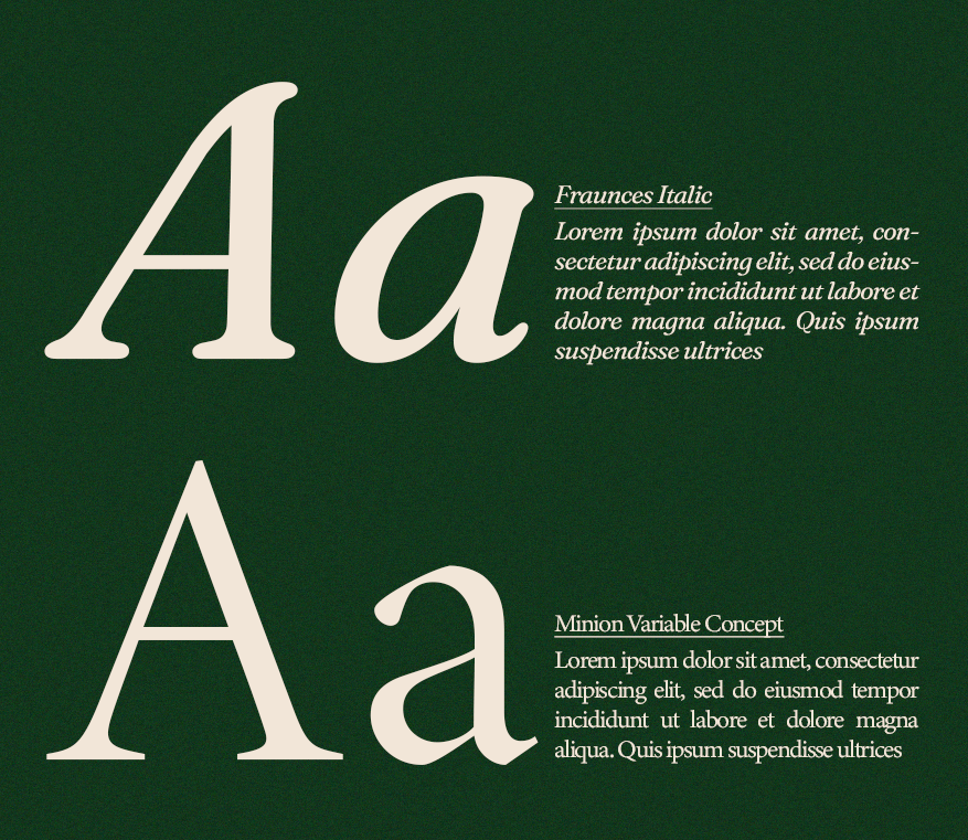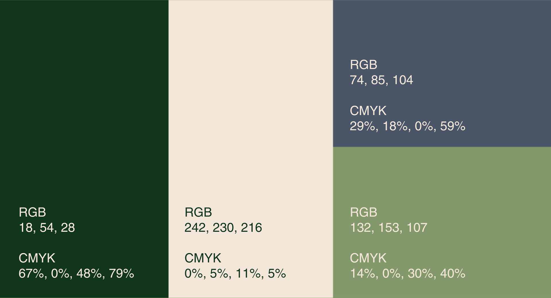 A paleta de cores é composta por tons escuros e naturais, com destaque para o verde profundo que transpassa calma equilibrado com os tons terrosos e claros que trazem suavidade e conforto, como o café. Para reforçar o estilo contemporâneo, foram escolhidas tipografias que mesclam elegância e leveza.