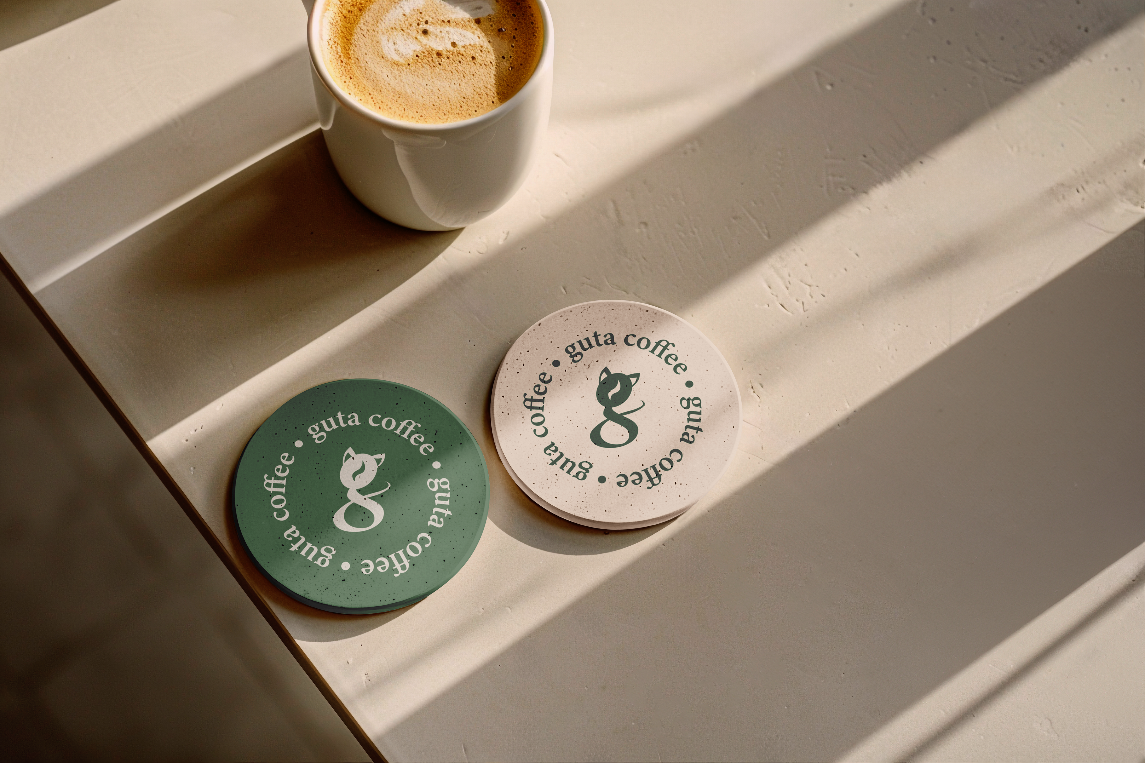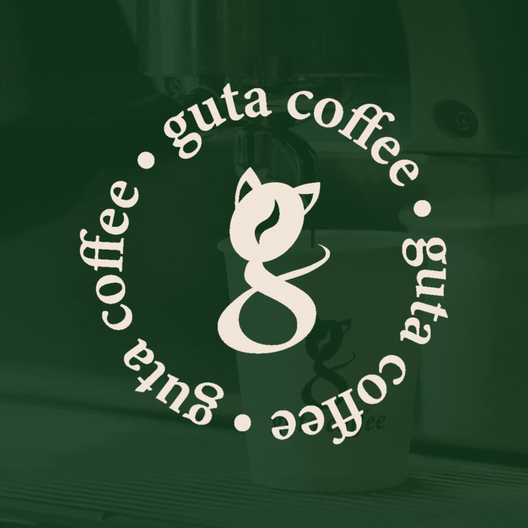 A identidade visual da Guta Coffee foi elaborada para transmitir sofisticação, conforto e acolhimento. O logotipo incorpora a letra “g” em forma de gato e a fumaça interna representando a fumaça de um café quentinho., elemento central da identidade, reforçando a ideia de companhia, afeto e presença silenciosa.
